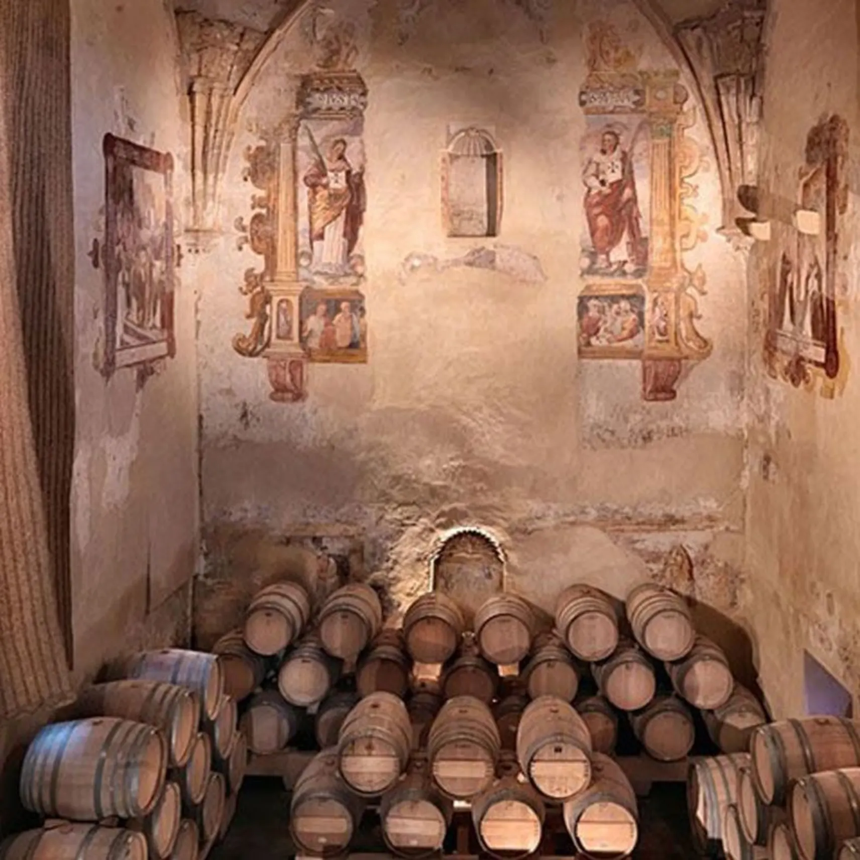 - Convento del Siglo XVI: visitaremos la bodega situada en el antiguo oratorio del convento Trinitario de los Descalzos. Un diálogo visual fascinante entre las barricas de roble y los frescos originales de las paredes de la iglesia.